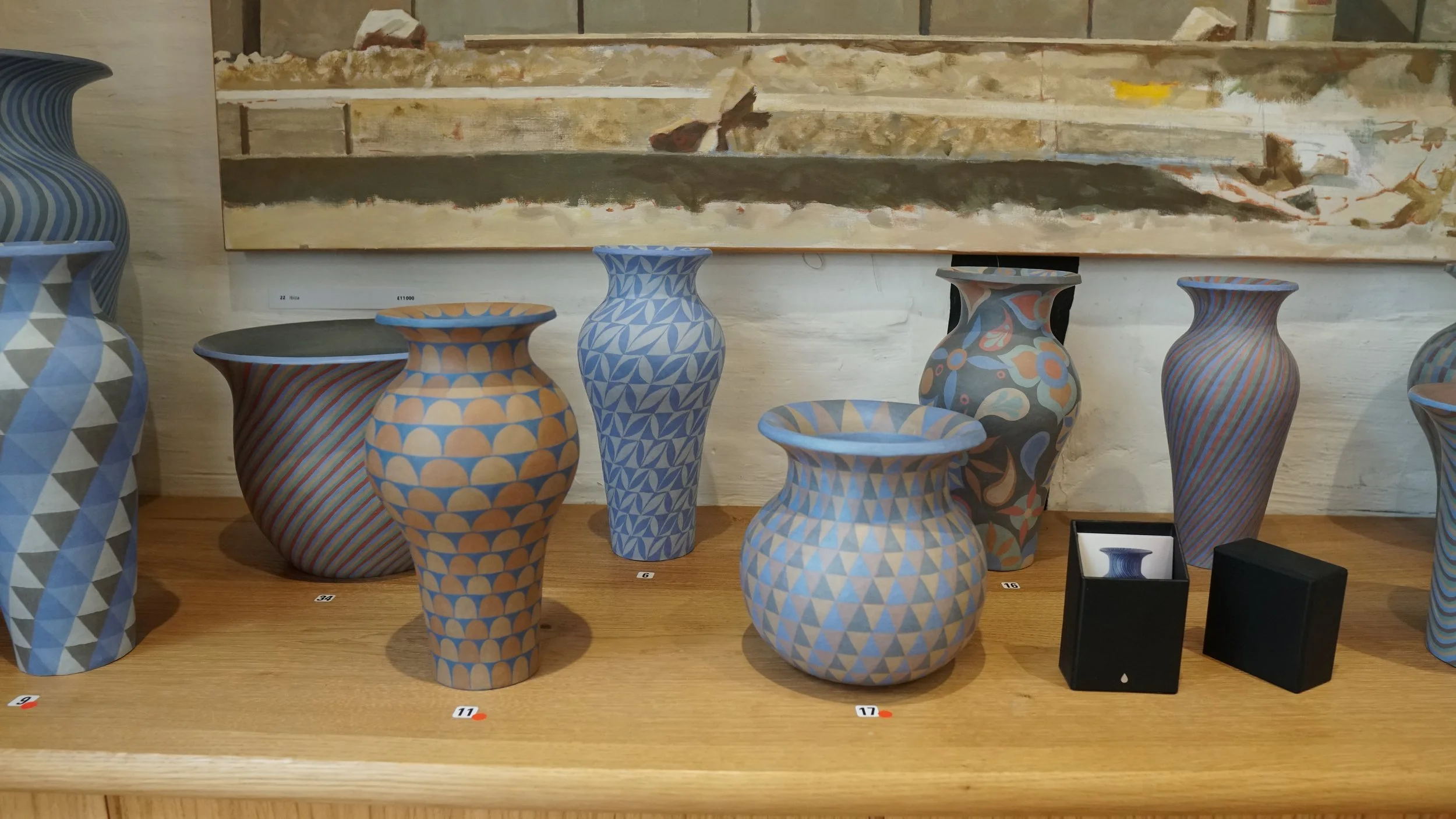 In addition to her work with books and albums, Louise produces coiled pots that are hand-painted with repeat patterns in coloured slip and then burnished. Her interest lies in combining pattern and colour on a form, often creating an optical effect.
